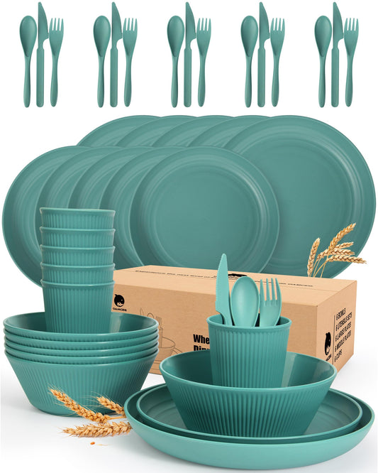 42 Pieces Wheat Straw Dinnerware Set - OAMCEG Plastic Dinner Set for 6, Kitchen Plates and Bowls Set, College Dorm Microwave Dishes, Unbreakable Plastic Outdoor Camping Dishes, Black